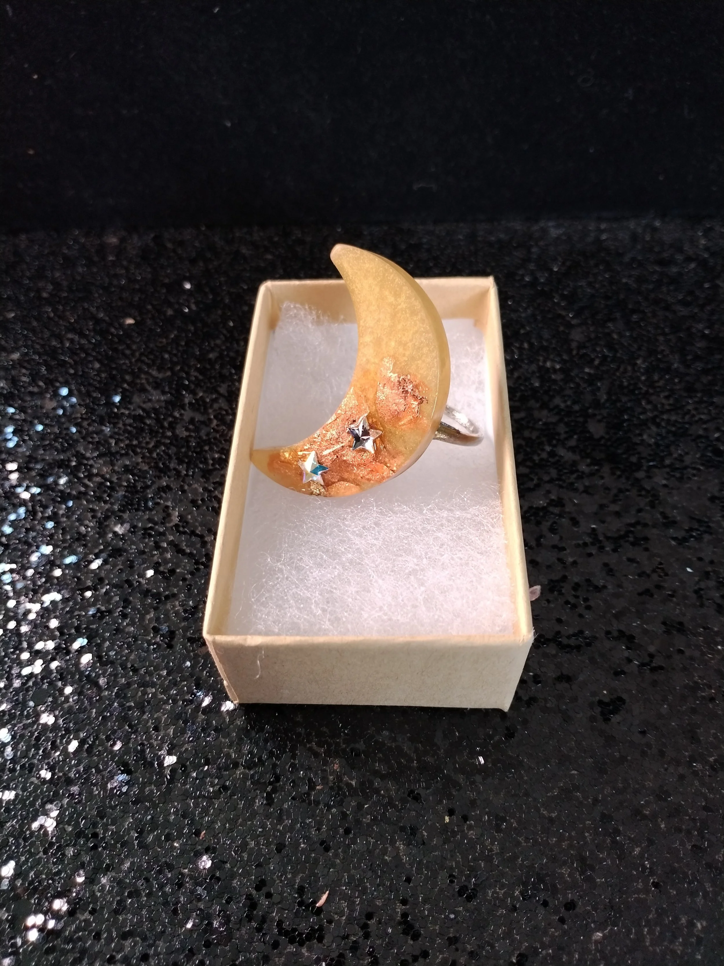 Handmade with Resin this waxing Crescent Moon Ring is Fun and Trendy! The waxing Crescent moon is the second phase in the cycle of the phases. This moon occurs once a month and can be seen around 9am. When this phase of the moon shows itself it is a perfect time to set new intentions for the month ahead and to work on self-love and improvement.